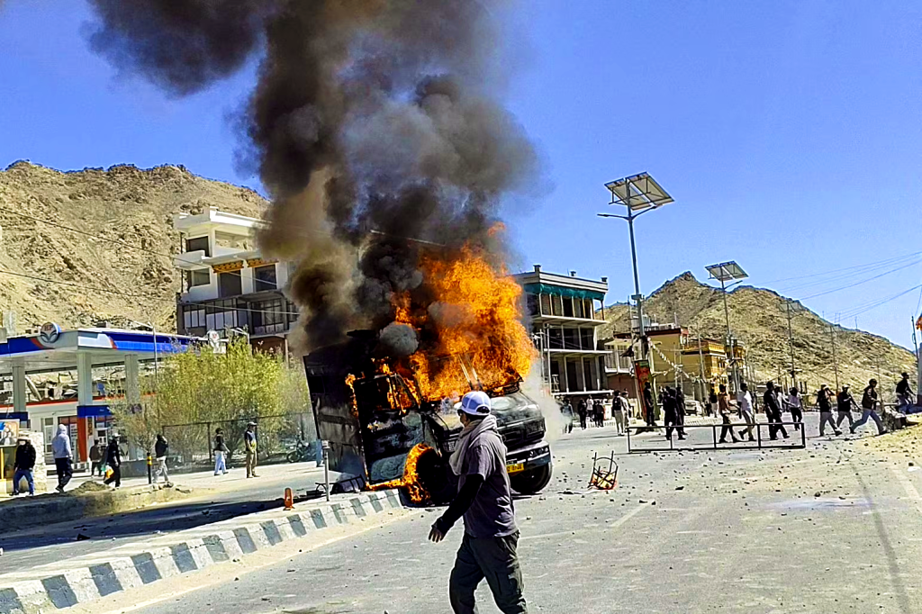 In the icy heights of the Himalayas, far from the boardrooms of Delhi and the stock exchanges of Mumbai, a fire has been lit. This fire is the September 2025 uprising in Ladakh, which culminated in violent clashes, the torching of a security vehicle outside the BJP office in Leh, and the immediate declaration of curfew. These acts express a profound rupture between the local population and a state apparatus that treats their land, water, and livelihoods as expendable inputs for capital accumulation. The unrest erupted on the fifteenth day of a thirty-five-day hunger strike organized by the Leh Apex Body, the Kargil Democratic Alliance, and allied groups demanding statehood, inclusion under the Sixth Schedule, job security, and protection of land rights. When two fasting protesters collapsed and were hospitalized, enraged youth surged into the streets and set fire to the BJP office. Police responded with live ammunition, killing six and injuring dozens. In the aftermath, Sonam Wangchuk called off the protest and publicly denounced the violence – a stance reminiscent of his 2024 decision to end a similar fast after student and environmental mobilizations, which he then dismissed as driven by “ulterior motives.” Meanwhile, national media outlets and BJP-aligned commentators have launched a coordinated propaganda campaign branding the demonstrations as “Congress-instigated,” attempting to delegitimize the genuine and long-standing grievances of Ladakh’s people.